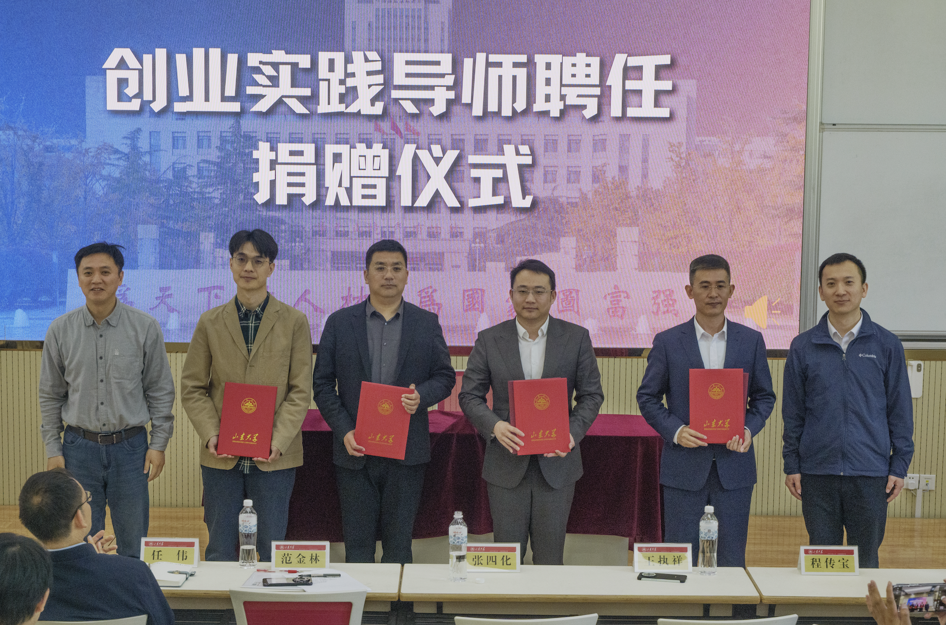 活动举行了创业实践导师聘任和捐赠仪式。张钦明、许浩然、程传宝、王执祥四位企业家校友受聘成为Williamhill威廉希尔浪潮williamhill中国创业实践导师。四位企业家校友以实际行动支持母校建设,向学院捐赠专项资金,用于支持实验室建设与创新人才培养工作。范金林书记与张四化书记上台为四位校友颁发创业实践导师聘任证书和捐赠证书。