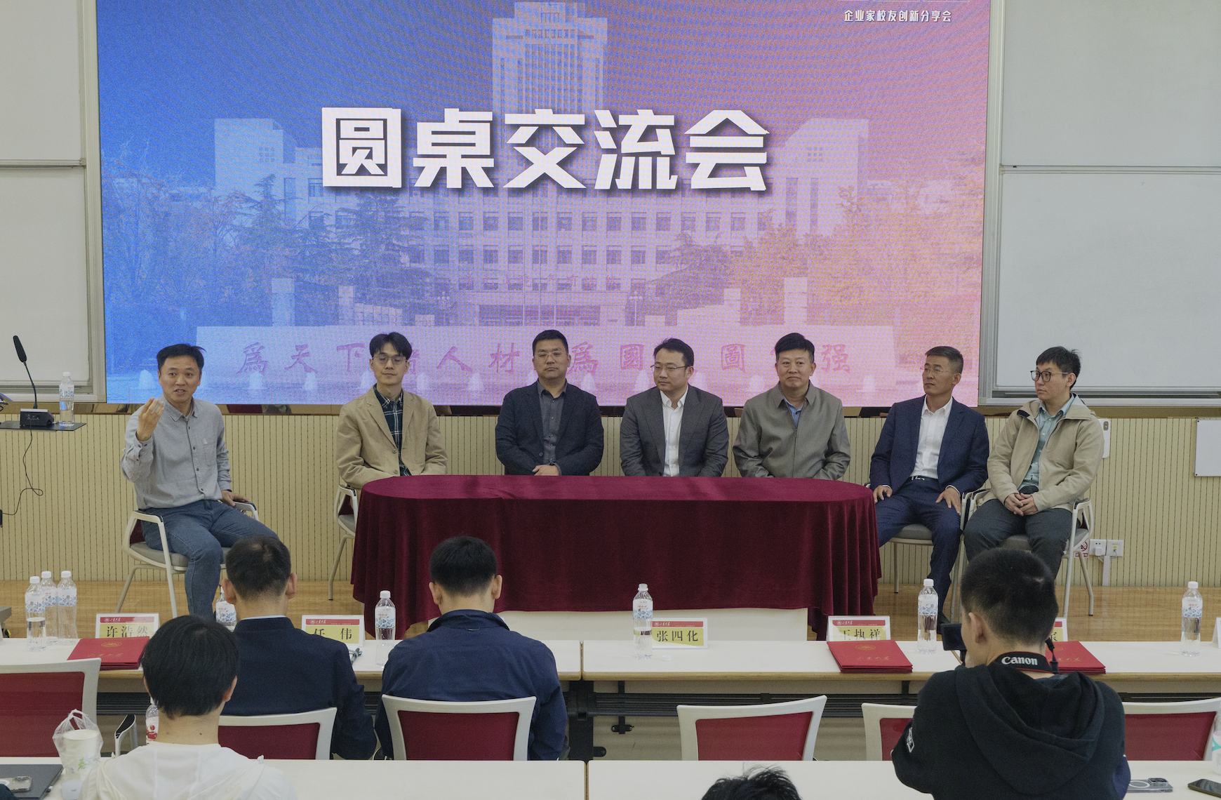 在圆桌交流环节中,张四化书记与六位校友共同围坐在讲台上,与现场学生围绕职业发展路径、创业心态准备、人工智能产业前景等问题进行了深度互动。校友们坦诚分享、悉心指导,为同学们未来的求职与创业提供了宝贵建议。