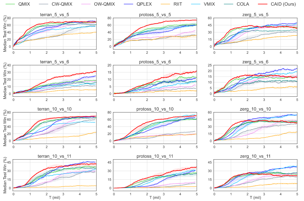 论文在SMACv2等多个挑战性上下文多智能体环境中进行测试,验证CAID在未见任务上的泛化性能,并与ROMA、RODE、QMIX等主流方法进行对比,结果显示,CAID在泛化测试任务中的平均回报显著优于对比方法,在不同任务配置下展现出更强的鲁棒性与转移能力。进一步的消融研究与可视化分析(如t-SNE)也揭示了身份生成机制在表征学习和任务适应中的关键作用。