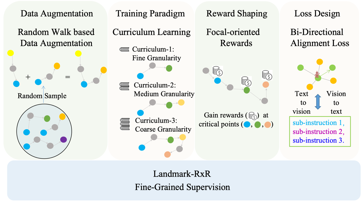 该框架通过引入高质量的细粒度标注,从数据增强、训练范式、奖励塑造及损失函数设计四个维度全面重塑了导航模型的学习过程。在具体实现上, 该研究包含四大核心创新:首先,利用Landmark-RxR数据集中精确的“子指令-子轨迹”对,提出了基于随机游走的数据增广方法,有效消除了训练与验证环境间的域差异;其次,设计了基于数据粒度的课程学习范式,让智能体(机器人)由浅入深地掌握导航技能;再次,引入聚焦导向的奖励机制,强化对关键地标的感知;最后,创新性地提出了双向对齐损失,在传统的“文本到视觉”对齐基础上,增加了“视觉到文本”的逆向约束,从而实现了更鲁棒的跨模态语义对齐。