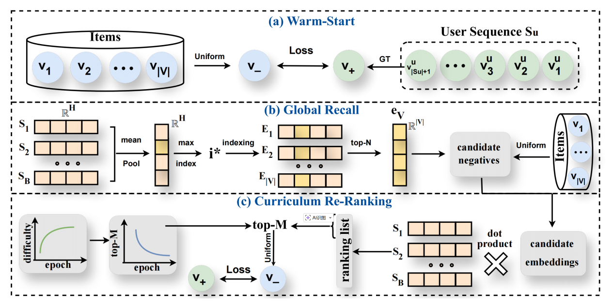 负采样在序列推荐系统中扮演着至关重要的角色,它通过提供对比信号,帮助模型精准区分用户的偏好与非偏好物品。然而,现有的主流负采样方法通常直接从随机物品子集中抽取得分最高的“困难负样本”。这种做法面临着三大痛点:一是过早引入高难度样本易导致早期训练崩溃;二是仅针对小规模子集打分导致缺乏全局视野;三是固定的排名策略无法精细控制模型的学习难度。为攻克上述挑战,研究团队创新提出面向序列推荐的负样本“召回-重排”机制(R2NS)。该方法模拟循序渐进的学习过程,主要通过三个核心阶段来实现:首先在“预热启动”阶段,采用基础的均匀负采样稳固模型能力,避免因过早引入困难样本而导致训练失效;随后在“全局召回”阶段,利用高效的最大索引近似方法突破局部限制,直接从全量物品中筛选候选负样本,为模型引入全局维度的对比信号;最后进入“课程重排”阶段,引入基于课程学习的排名策略,随着训练的推进,动态且精细地调节负样本的学习难度。
