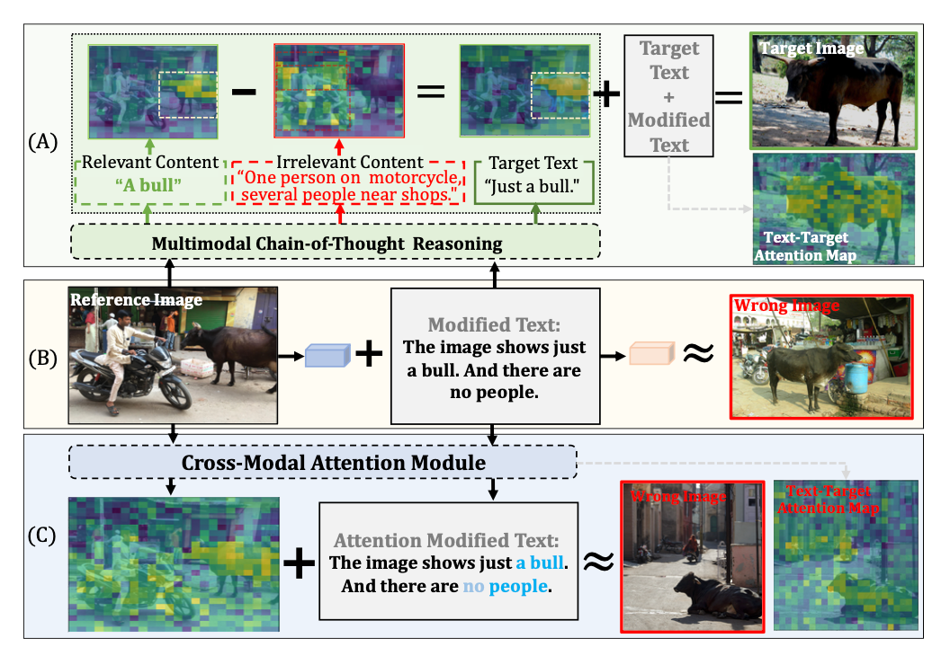 图1:与主流组合图像检索方法对比,MCoT-MVS(A)的方法流程